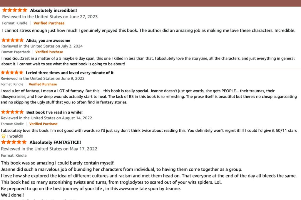My high fantasy books, including GoulCrest and Vuthrie, are published under Alicia Jeanne. These books typically focus on adventure and found family. If there is any romance in these books, it is closed door romance and will always be a side plot as opposed to a main focus.